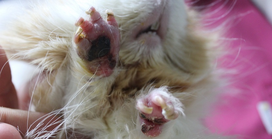 Jedná se o zánětlivé onemocnění kůže, vazů a svalů. Může ve vážnějších případech postihnout i kosti. Zvíře velmi trpí, je neklidné, nepohyblivé. Na postižené pacce se objeví nejprve prosáklý, načervenalý otok. Drápky se kroutí. S postupem nemoci se začnou deformovat celé prsty. Kůže je silně prokrvená, citlivá, snadno se poraní. Tím vznikne vstupní brána pro infekci. Vytvoří se léze. V nejhorších případech může dojít i k amputaci postižené končetiny.