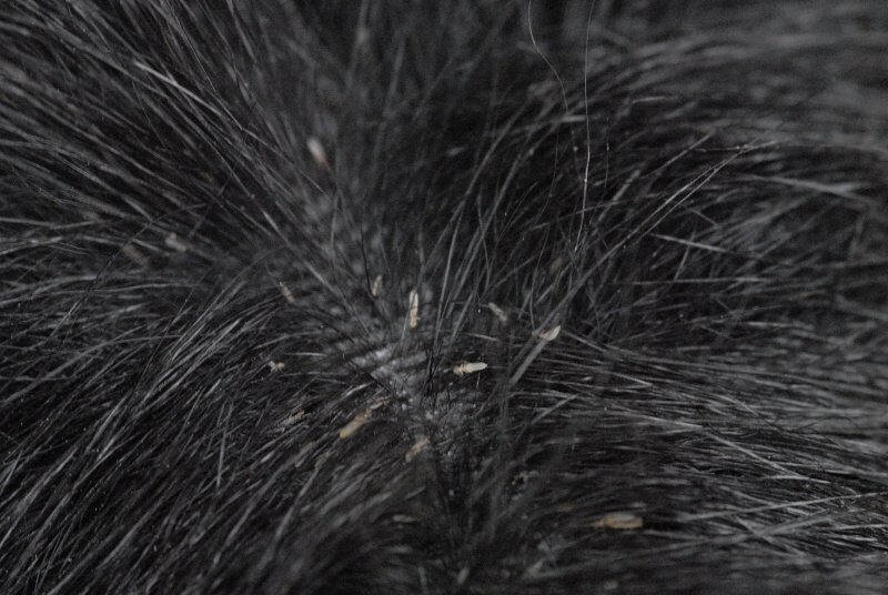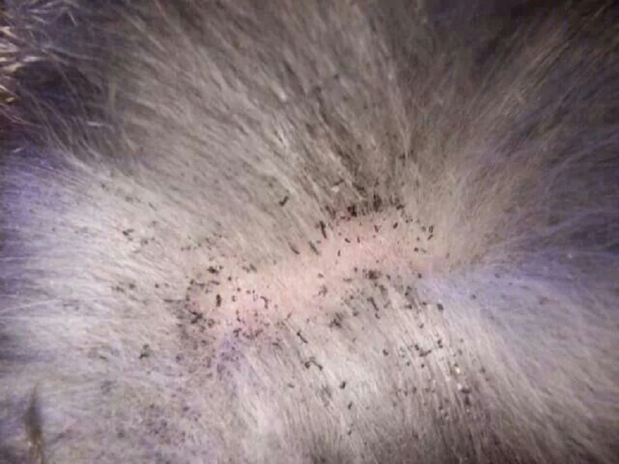 Na obrázku je bleší trus. Malé černé kuličky, které po rozmáčknutí barví červeně (krev).